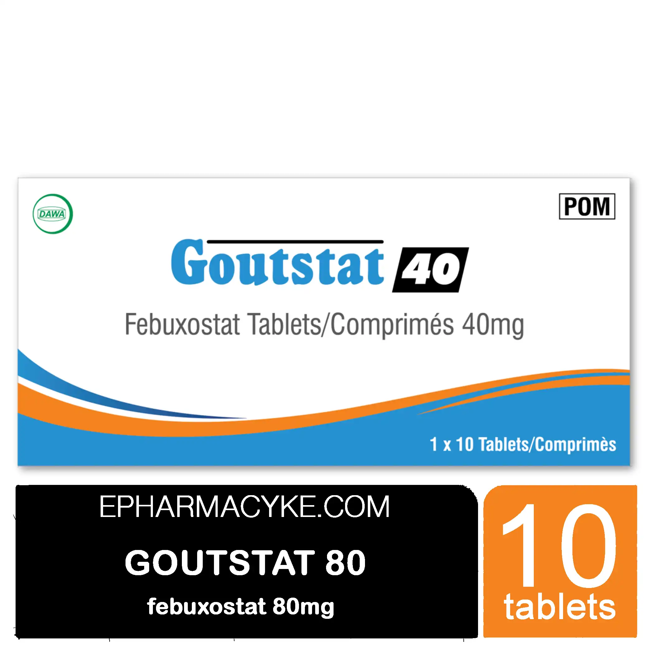 GOUTSTAT FEBUXOSTAT 40MG TABLETS are specifically designed to effectively manage gout symptoms and lower uric acid levels. Each pack contains 10 tablets, providing a convenient solution for those suffering from this painful condition. With GOUTSTAT, you can enjoy a better quality of life without the discomfort of gout flare-ups. Ideal for the Kenyan market, these tablets are easy to incorporate into your daily routine. Trust GOUTSTAT to help you regain control over your health and enjoy the activities you love.