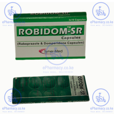 ROBIDOM SR contains; Rabeprazole is a proton pump inhibitor with actions and uses similar to those of omeprazole. It is given by mouth in the treatment of gastro-oesophageal reflux disease, peptic ulcer disease or Zollinger-Ellison syndrome. It also contains Domperidone; a dopamine antagonist with actions and uses similar to those of metoclopramide. It is used as an antiemetic for the short-term treatment of nausea and vomiting of various aetiologies in Kenya.